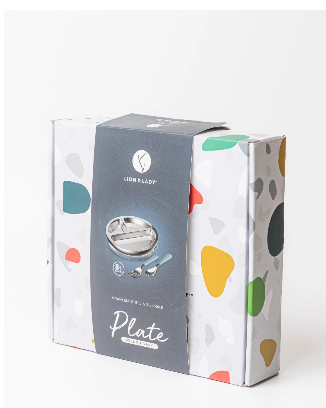 Lion & Lady 18/8 Stainless Toddler Plate with Silicone Suction Base, Spoon and Fork - French Navy