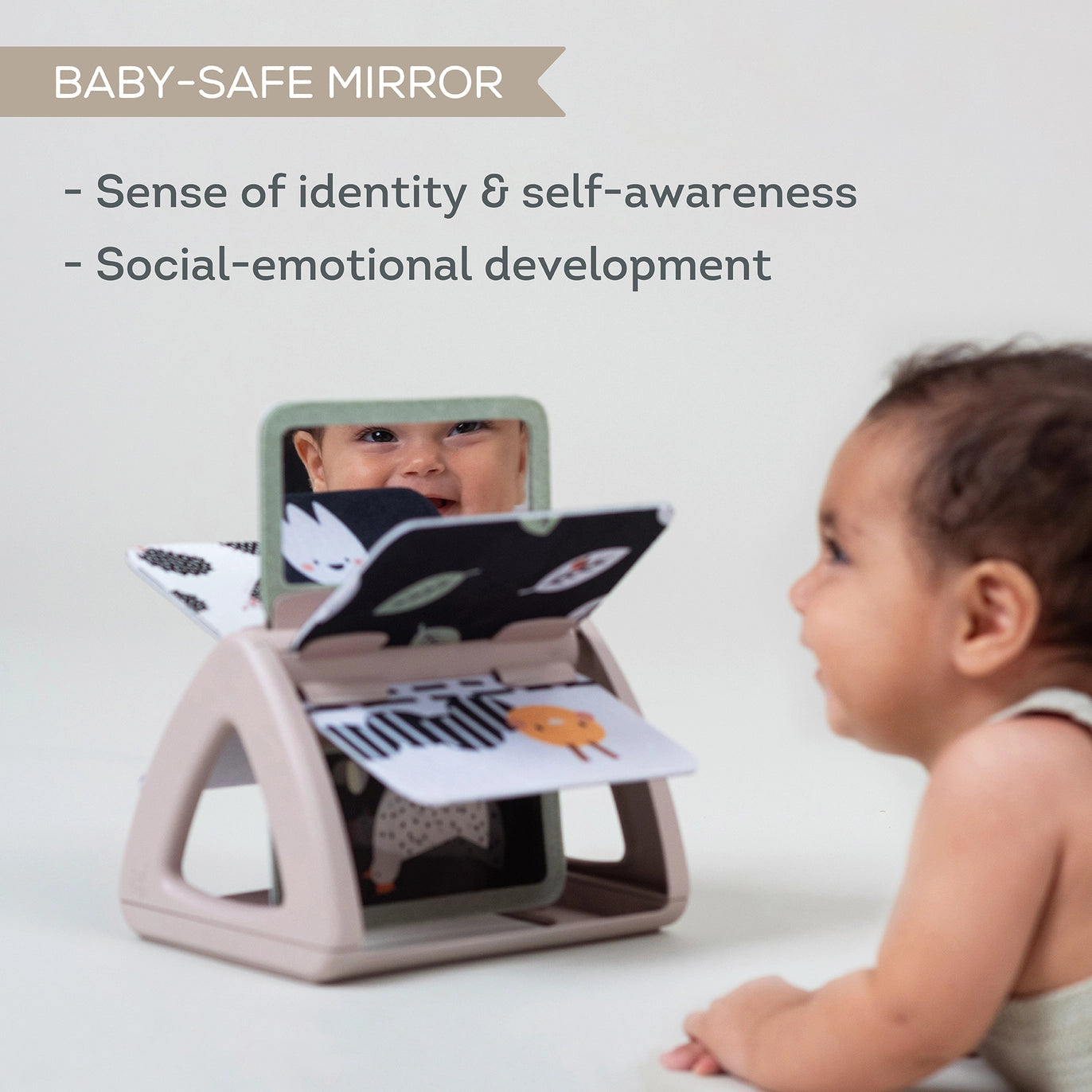 With a mirror and a hologram page, it introduces babies to reflective and sparkling elements, enriching their visual exploration. The gentle rattling sound upon spinning adds an auditory dimension to playtime.
