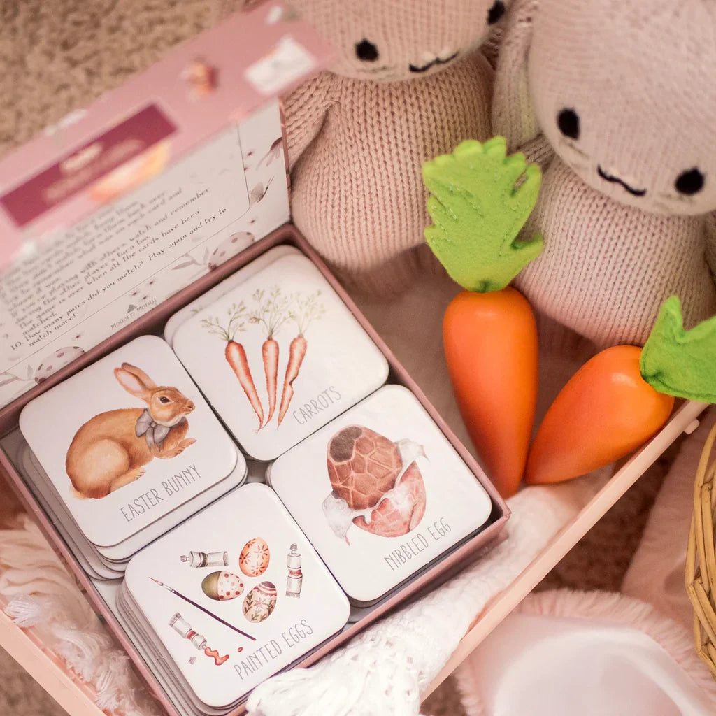 See the excitement on your child's face, much like when they unwrap their first foil-covered Easter egg, as they dive into the magical world of Easter through play. Our Easter Memory Game invites families to share in the warmth and joy of this special time of year. Perfect for Easter baskets, spring celebrations, or as a special gift, this beautiful game will become a cherished heirloom, brought out each year at Easter, creating playful moments of joy and laughter for the whole family.