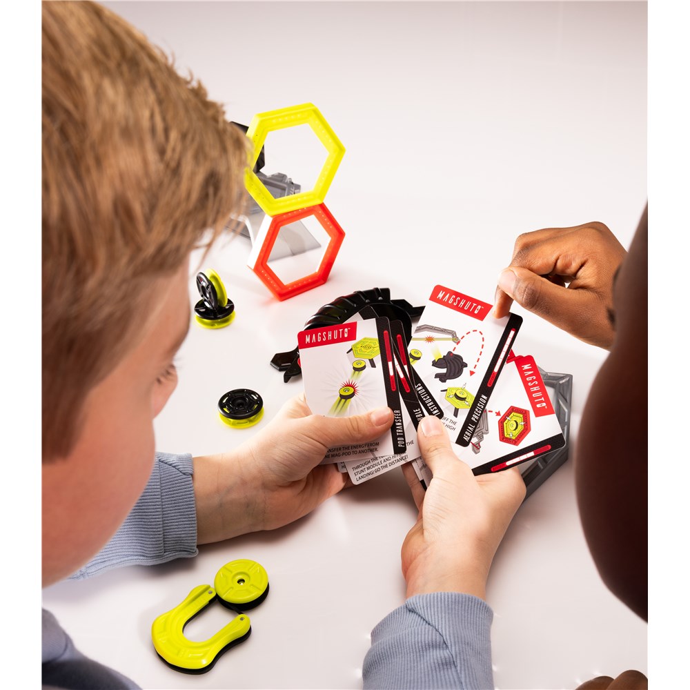 Mad, rad, magnetic action! This action-packed set features ramps, rebounders, rings, a tunnel, and a magnetic target - just about everything you need to build the most insane stunts. Set it up any way you want, then load one of the Mag-Pods into the shooter, pull it back with just your finger, aim, and launch. Ricocheting, rebounding, flipping, colliding, flying, tunnel-gliding, and more... Take on the 15 included challenges. Invent your own stunts. Combine with other Magshuto sets and incorporate your environment. The only limits are the laws of physics! Magshuto.