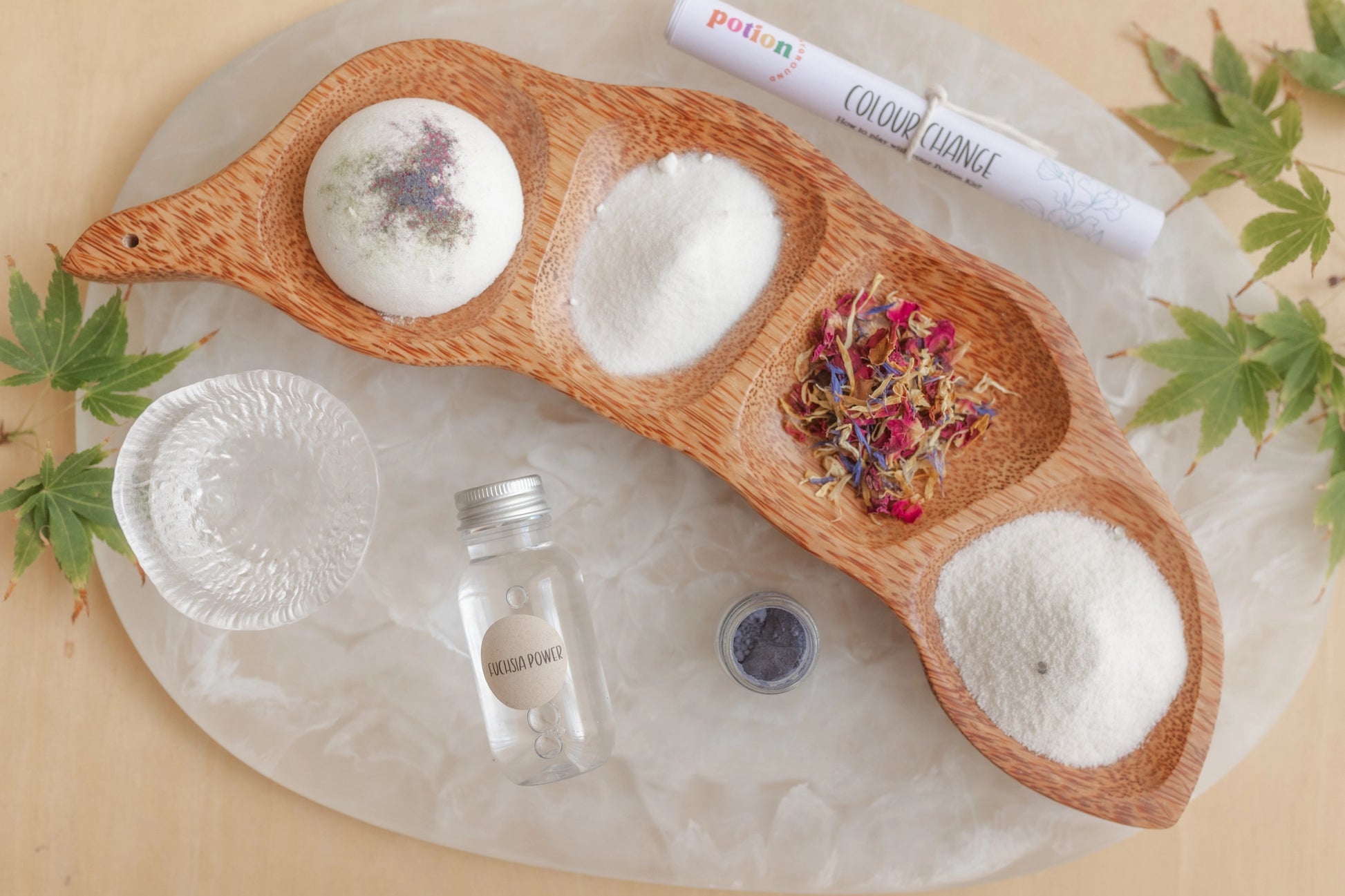 Ingredients: Citric acid, Bicarbonate of Soda, Dried Florals, Butterlfy Pea Powder, Vinegar + Scent.