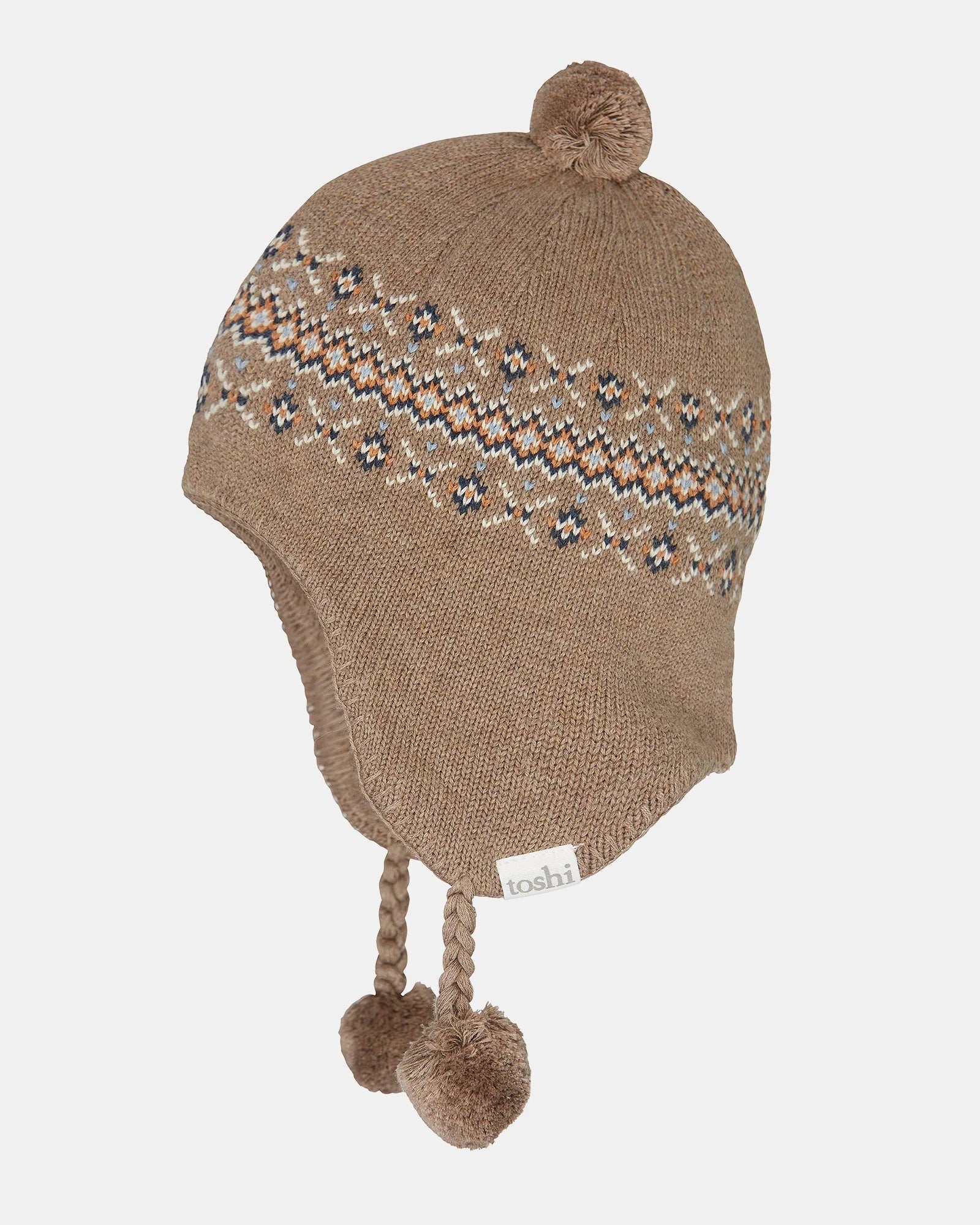 Toshi Earmuff Storytime is crafted from the finest quality certified 100% organic cotton yarn. Organic certification ensures the beanie is gentle on heads, as well as our precious environment. The beautifully textured melange yarn brings an element of refinement to the beanie. This beanie features ear flaps for cosy and nurturing protection from the elements. Pom poms introduce a cute and playful look. The baby beanie Earmuff Storytime is fully lined for enhanced comfort and greater warmth during our cooler months.